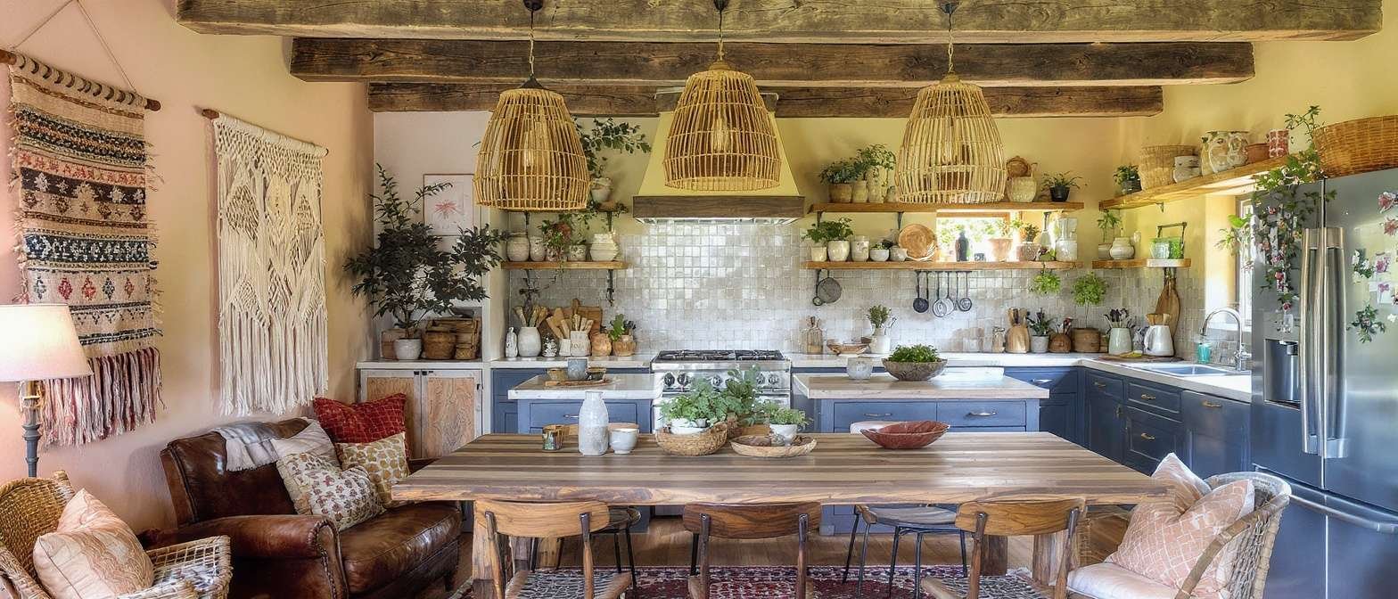 A woven table runner can add a cozy touch to your rustic boho kitchen. This simple element brings warmth and texture to your dining space. The image shows a beautifully arranged table featuring a natural wood surface, adorned with a soft, woven runner that complements the earthy tones of the kitchen.