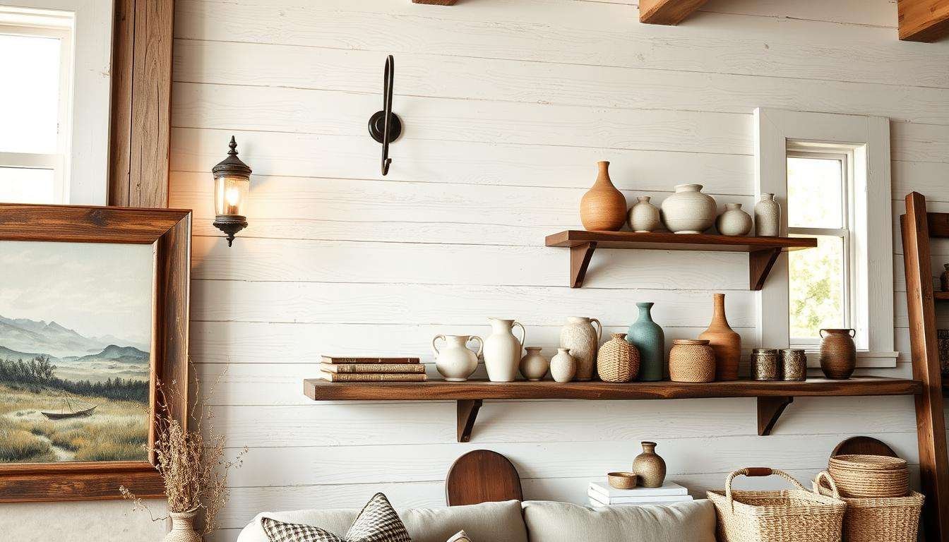 A rustic farmhouse-style open shelving unit, its wooden planks adorned with an artful arrangement of vintage-inspired décor. In the foreground, a collection of antique books, ceramic vases, and weathered metal accents create a cozy, lived-in vignette. The middle ground features a hanging plant and a few framed botanical prints, casting soft shadows across the shelves. The background is filled with natural light, streaming in through a large window, illuminating the earthy tones and textures of the display. The overall mood is one of warmth, nostalgia, and a touch of whimsy, perfectly capturing the essence of a cozy farmhouse living room.