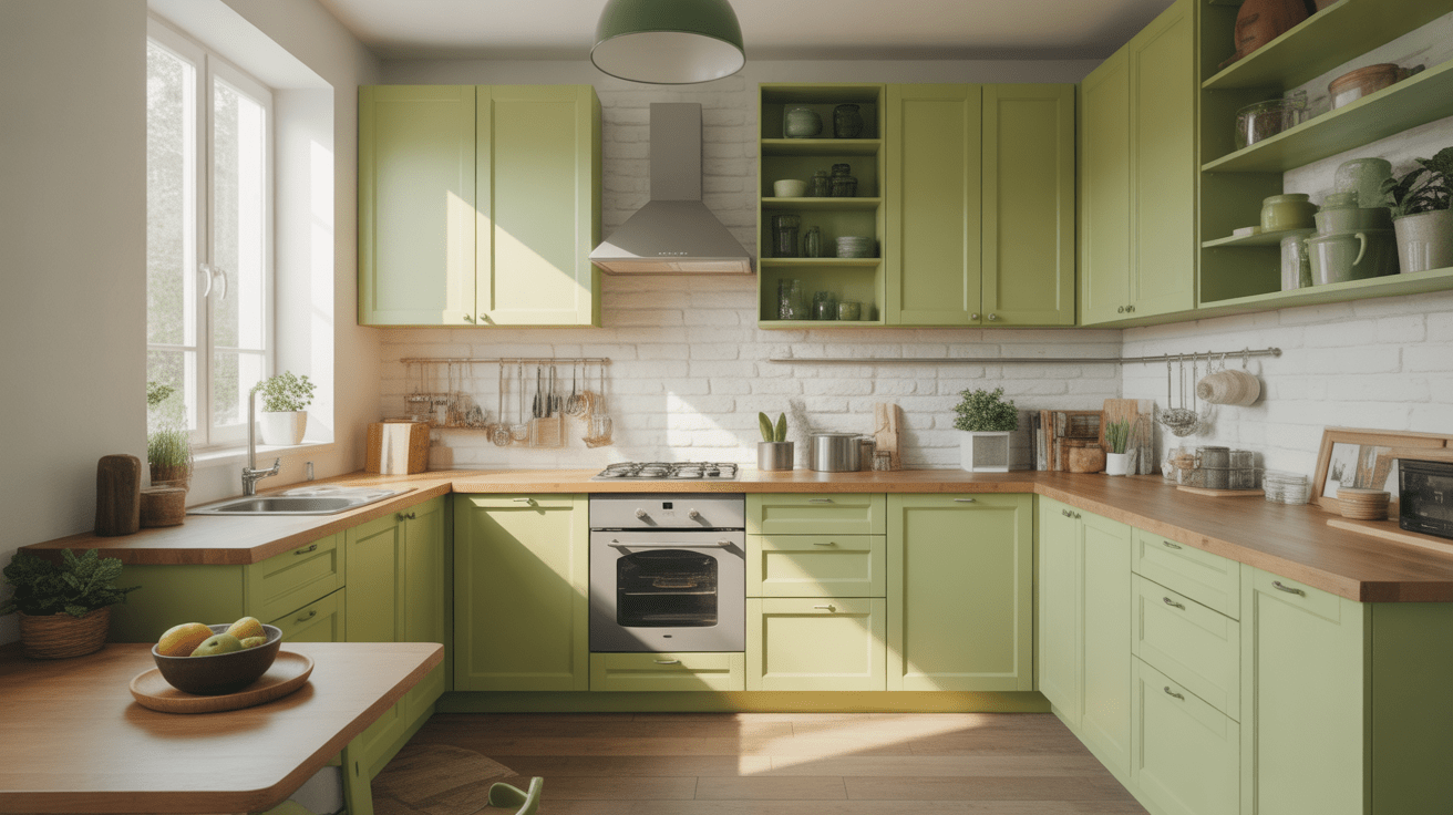 This kitchen design showcases a delightful mix of lime green accents that bring a fresh and lively vibe to the space. The cabinets, painted in a soft lime hue, create a cheerful atmosphere, making cooking feel more enjoyable.