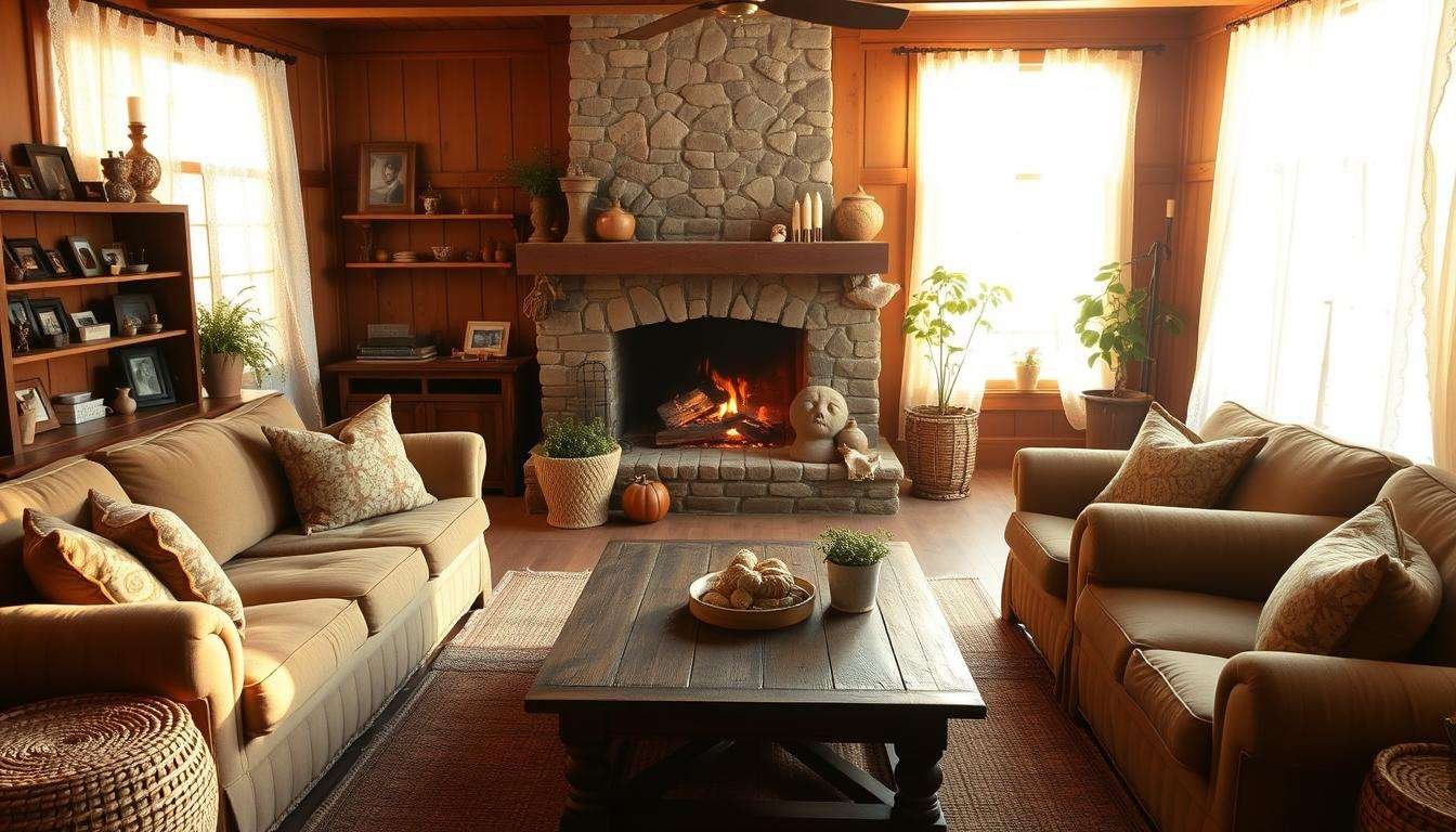 | Rustic | raw wood, heavy textiles | brick hearth close-up |