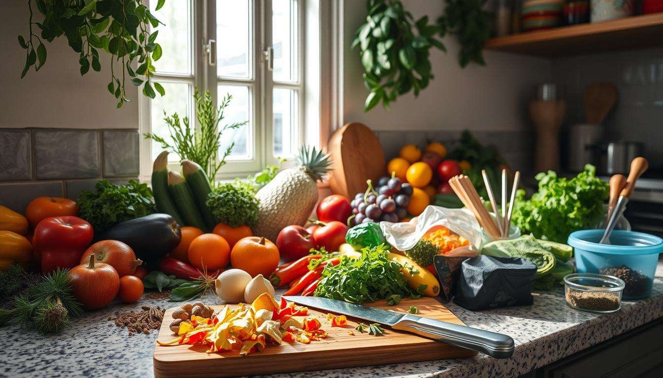 A well-stocked kitchen counter brimming with a diverse array of fresh ingredients. In the foreground, an assortment of vegetable scraps and trimmings - carrot tops, broccoli stems, onion peels - arranged artfully. In the middle ground, a cutting board with a chef's knife, showcasing the potential to transform every part into a delicious, zero-waste meal. The background features a variety of whole, unprocessed foods - leafy greens, root vegetables, grains - illuminated by soft, natural lighting that highlights their vibrant colors and textures. The overall mood is one of mindful abundance, inspiring the viewer to embrace a sustainable, waste-conscious approach to cooking.