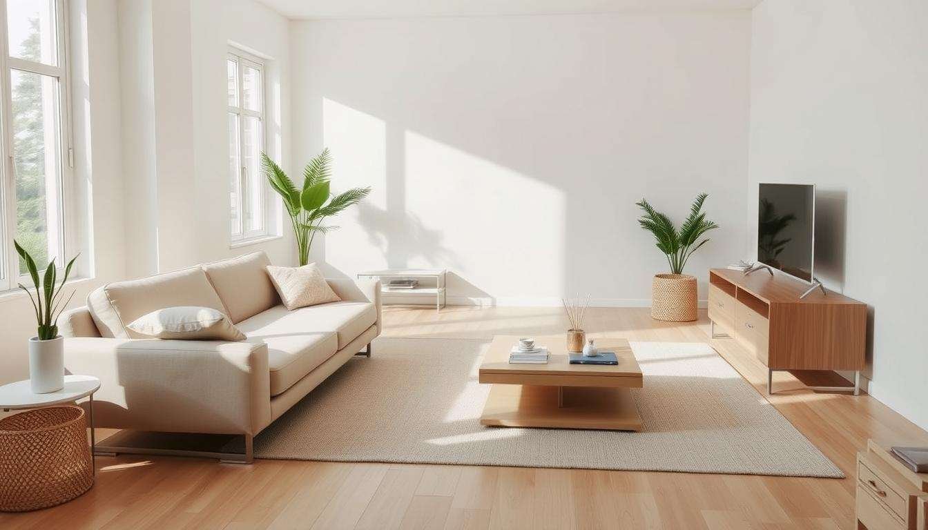 Photorealistic styling: I choose clean-lined pieces in sunlit neutrals, a solid wood coffee table, and a plush rug to create tactile contrast. Natural light sculpts the sofa and highlights grain and texture.
