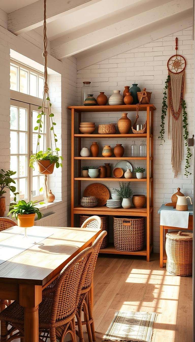 I begin with natural materials for shelves and trim, add rattan stools and baskets, and use artisanal tile for a refined pattern pop. Materials like bamboo, stone, and hand-formed ceramics add subtle irregularity that reads as depth rather than clutter.