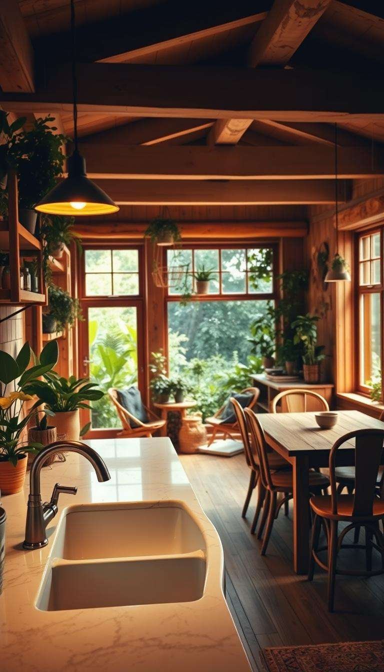 A sun-drenched kitchen with rustic wooden beams, whitewashed walls, and warm earthy tones. Hanging plants sway gently in the breeze, casting soft shadows on the natural linen curtains. A large farmhouse-style table takes center stage, adorned with a vibrant boho-inspired tablecloth and an eclectic mix of ceramic dishes, woven placemats, and vintage glassware. In the corner, a cozy nook with a plush velvet armchair and a macrame wall hanging creates an inviting reading or relaxation space. Overhead, a brass pendant light casts a golden glow, complementing the weathered wood accents and the hint of copper in the kitchen accessories. The overall atmosphere is one of laid-back elegance and soothing, natural beauty.